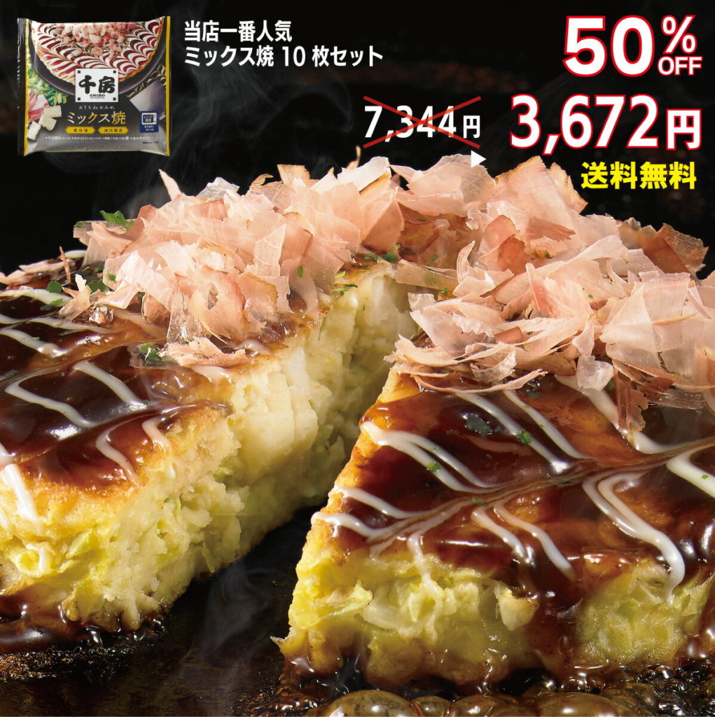 【速報】楽天ランキング:【バーゲン市場】24時間50%OFF+ポイント5倍【一番人気】千房 ミックス焼 10枚入り【送料無料】 冷凍 お好み焼き レンジ 簡単 本場大阪(4.51点)