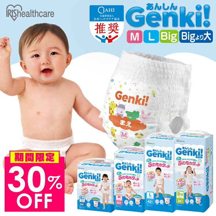 【話題】楽天ランキング:\24hタイムセール!30%OFF!18日10時~/【3袋】あんしんGenki!おむつ オムツ M 150枚 L 126枚 ビッグ 108枚 ビッグより大きい 72枚 パンツ ふわもちタッチ 肌に優しい 横モレ 最長12h さらさら おむつ 紙おむつ Genki あんしんGenki! アイリスオーヤマ * [2603SS](4.68点)